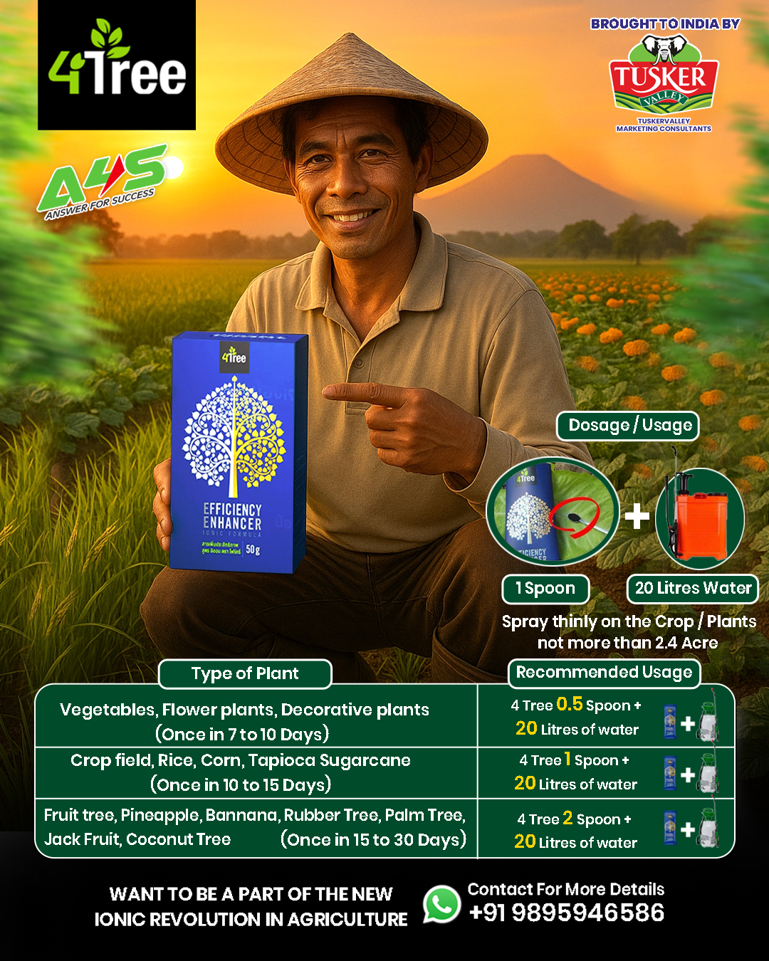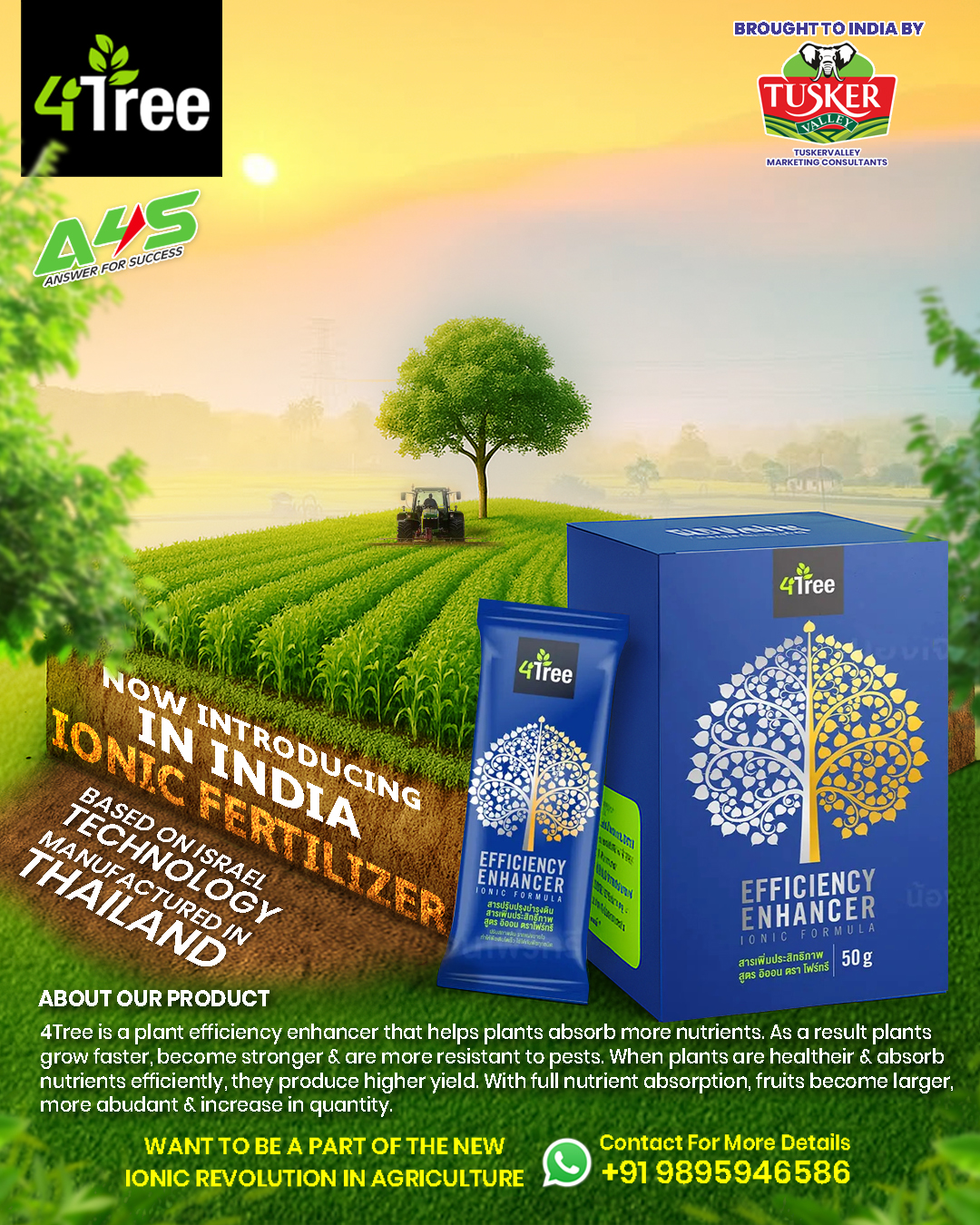 4Tree is a plant efficiency enhancer that helps plants absorb more nutrients. As a result plants grow faster, become stronger & are more resistant to pests. When plants are healtheir & absorb nutrients efficiently, they produce higher yield. With full nutrient absorption, fruits become larger, more abudant & increase in quantity.